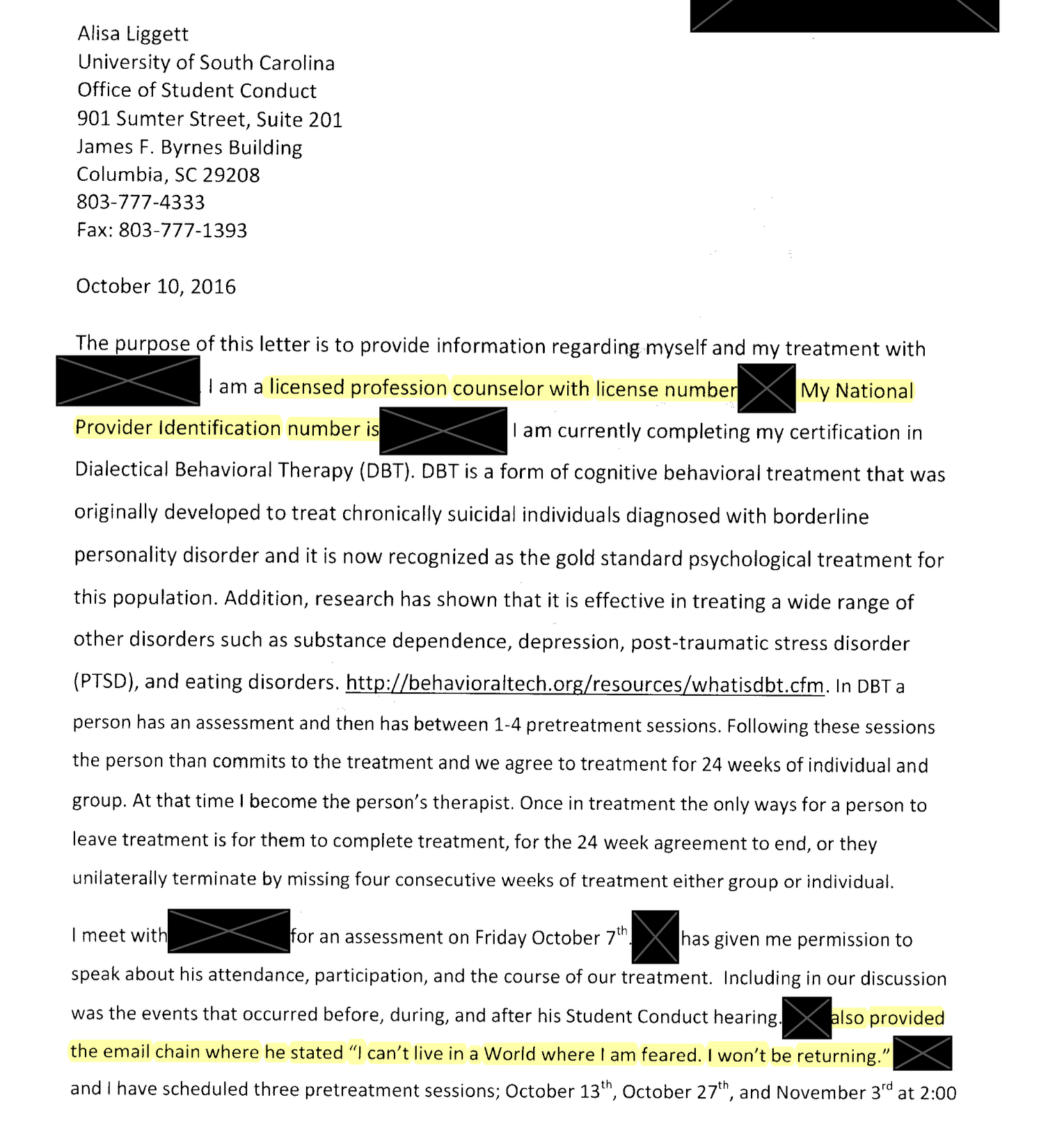 "1. Have [your counselor], who must be a licensed clinician, send a letter on his letterhead indicating how long you have been under his care, your frequency of attendance... and that he is continuing to be your provider. 2. His letter must also include his acknowledgment of the suicidal threat on Sept. 30."